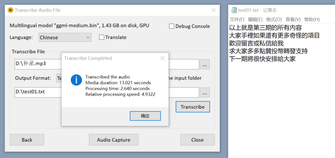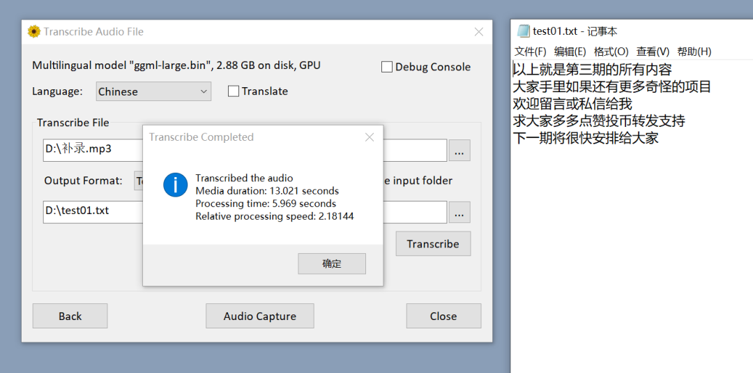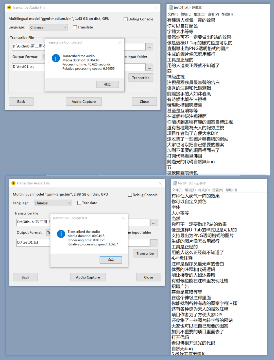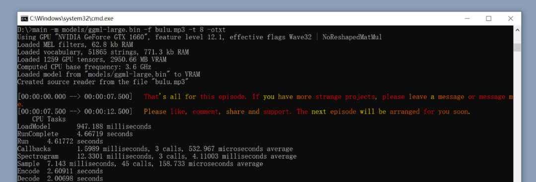 测试用的显卡是GTX1660,转换速度在可接受范围之内,上面这种简短的句子,用大的识别模型,在某些简单的语境条件下,以及加上最重要的因素——运气好的话,竟然有100%的准确度。