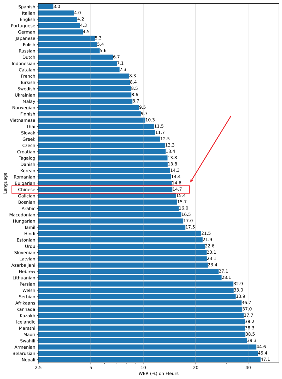 官方给出的Whisper识别能力图如下,主要还是用来识别英文。