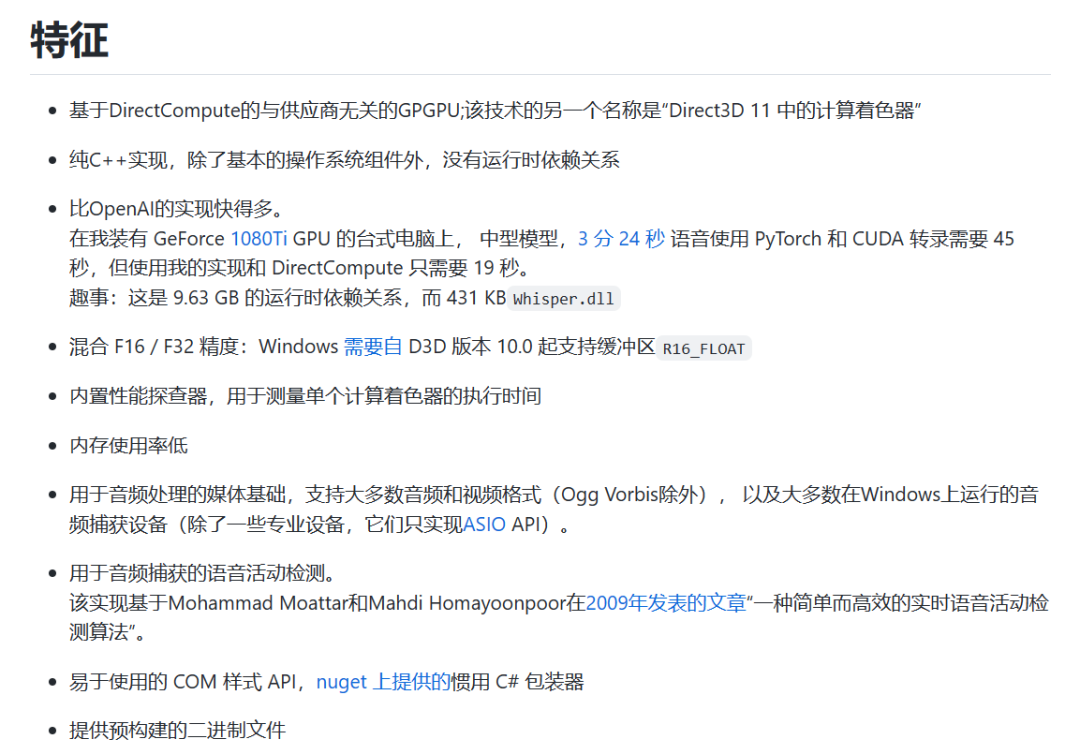 在官方的GitHub页面上,可以看到这个工具还有不少特点,比如说项目采用纯C++实现,除了系统基本组件没有运行依赖、内存占用低、支持大多数音频和视频格式、支持大多数音频捕获设备、比OpenAI的实现还快。