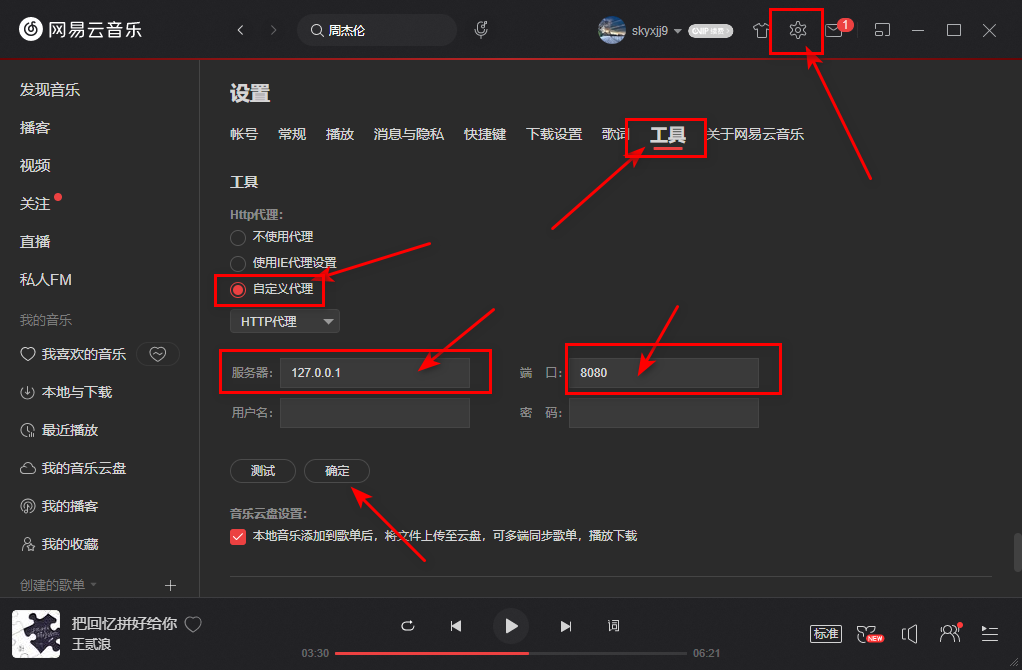 然后这个解锁灰色的小工具会自动创建一个代理服务。之后打开某疑云,点击应用右上角的齿轮图标(设置) – ⌊工具⌉ – 选择⌊自定义代理⌉。