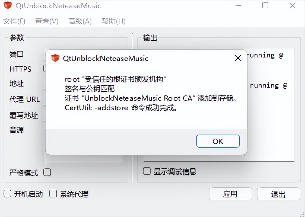 PS:个人使用时,可以将端口更改为80、443、8080等常用端口(参见对照表)以外的端口,并勾选HTTPS选项,以免占用其他软件的端口,影响其他软件正常运行。同时应在QtUnblockNeteaseMusic中的地址栏填入127.0.0.1,限制为本机访问,以免将端口暴露到网络中,影响安全。具体注意事项请参见QtUnblockNeteaseMusic的GitHub页面。