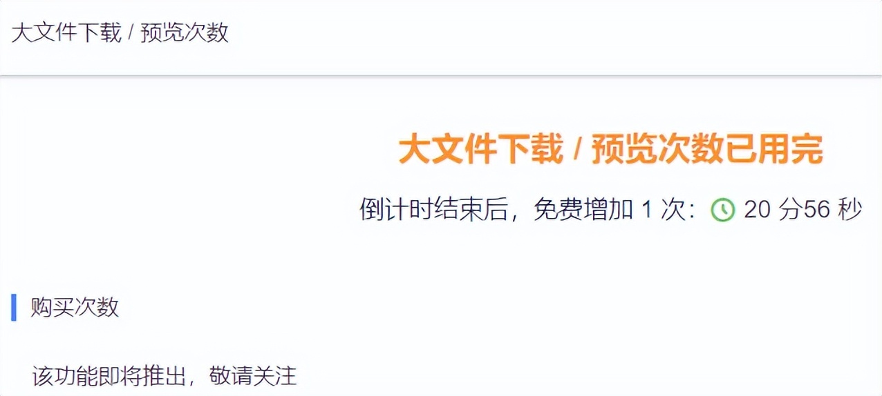 关于下载,网站号称永不限速,不过对下载大文件有次数限制,注册用户默认2次大文件下载。次数用完后可以等待倒计时,再次免费获取大文件下载。或者以后可以通过付费购买大文件下载次数。