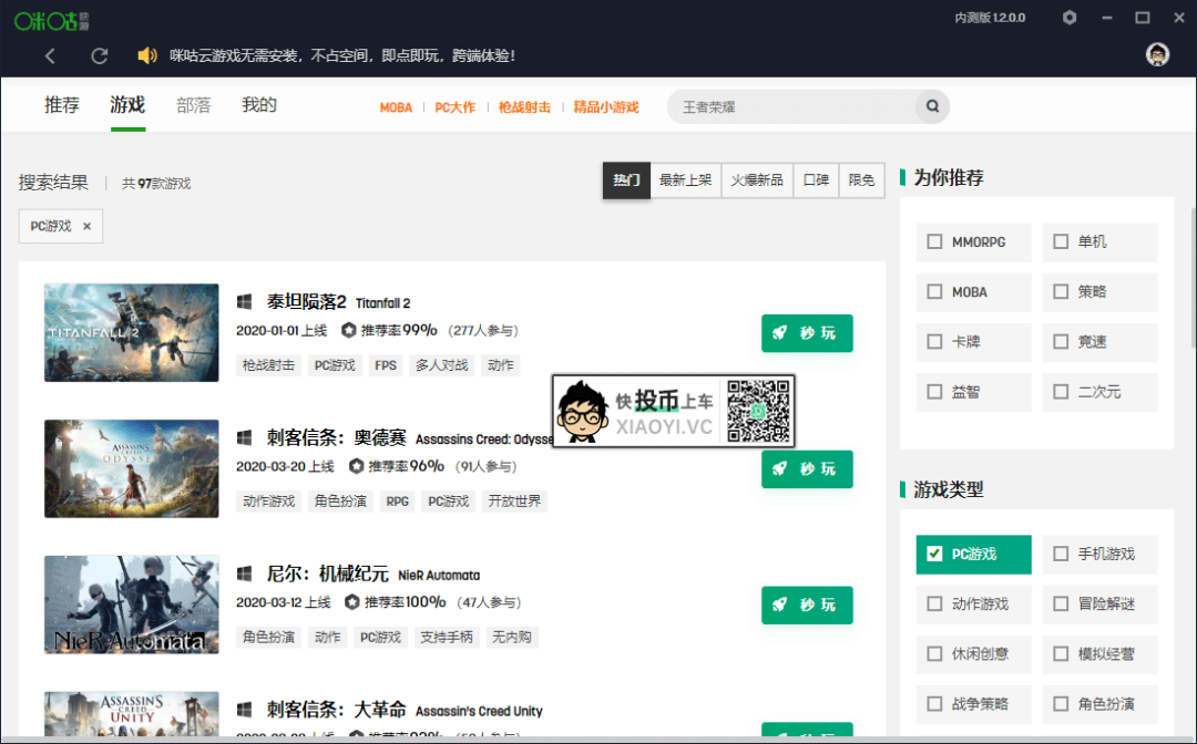 今天雷锋哥要给大家推荐由中国移动旗推出的「咪咕快游」现在内测阶段,游戏可以免费试玩,平台方面支持 Windows / 安卓。不知道以后会不会推出 MacOS / iOS 客户端。