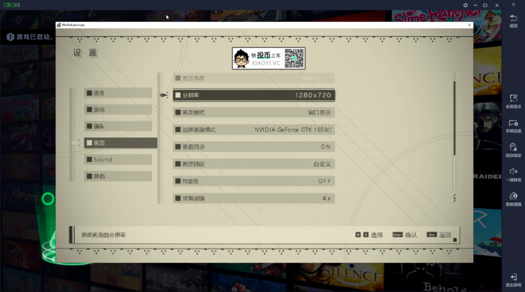 游戏的画质则可以进入游戏设置里面调整,这里可以看到「咪咕快游」的云游戏采用的是「GTX 1650」显卡,设置更高的分辨率和画质需要更高的带宽,否则出现延迟卡顿。