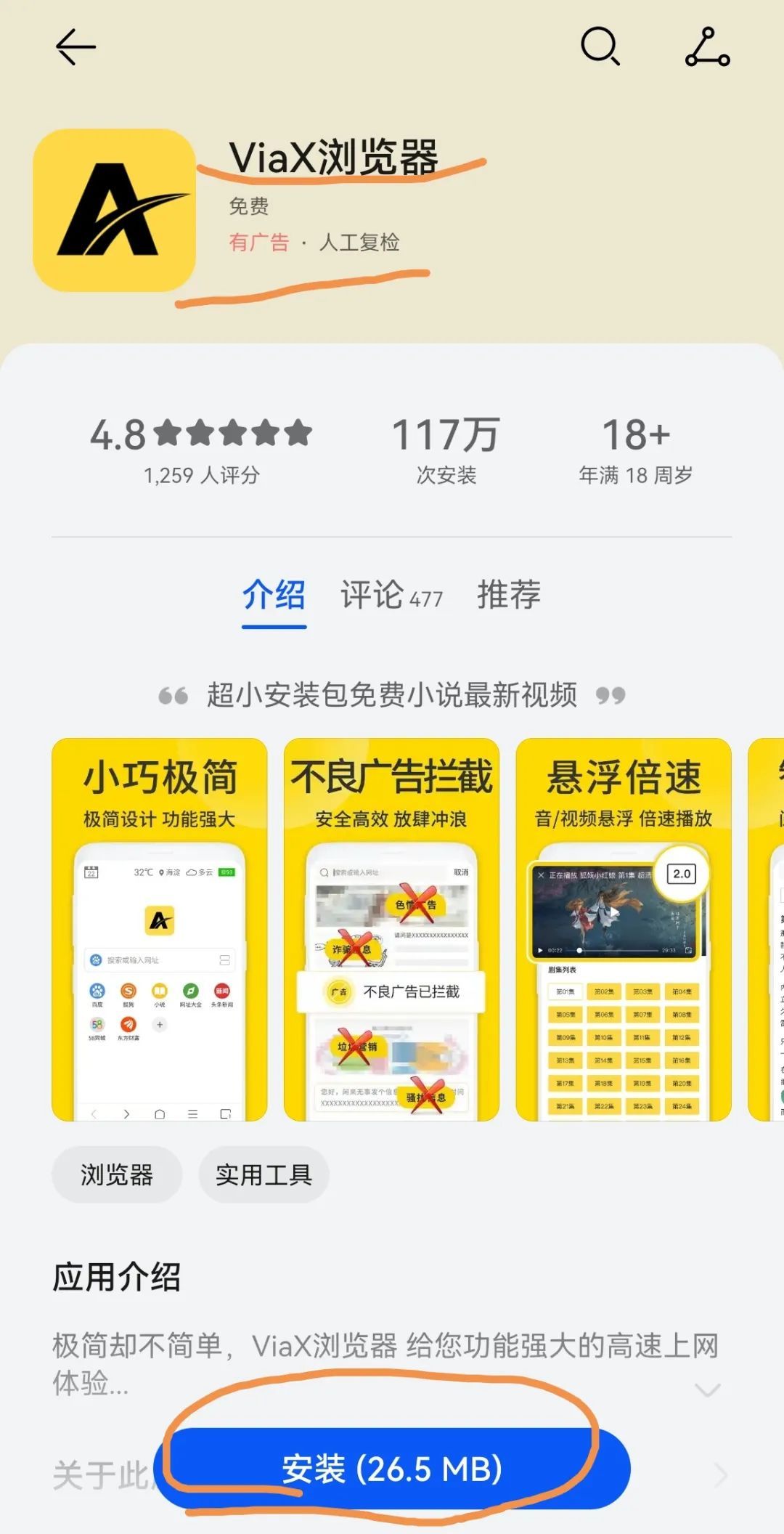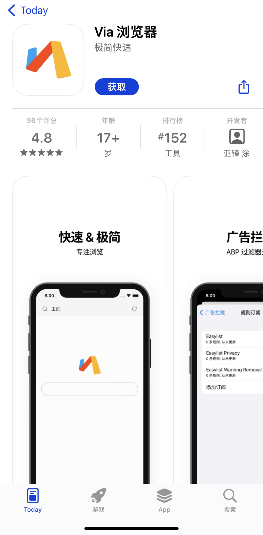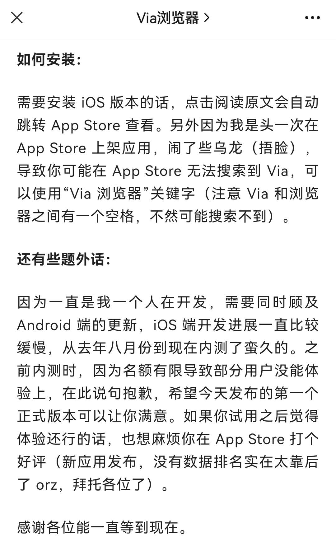 这里还需要提醒大家,对于 iOS,可以直接在 App Store 上搜索,需要搜索“Via 浏览器”关键字(注意 Via 和浏览器之间有一个空格,不然可能搜索不到)。