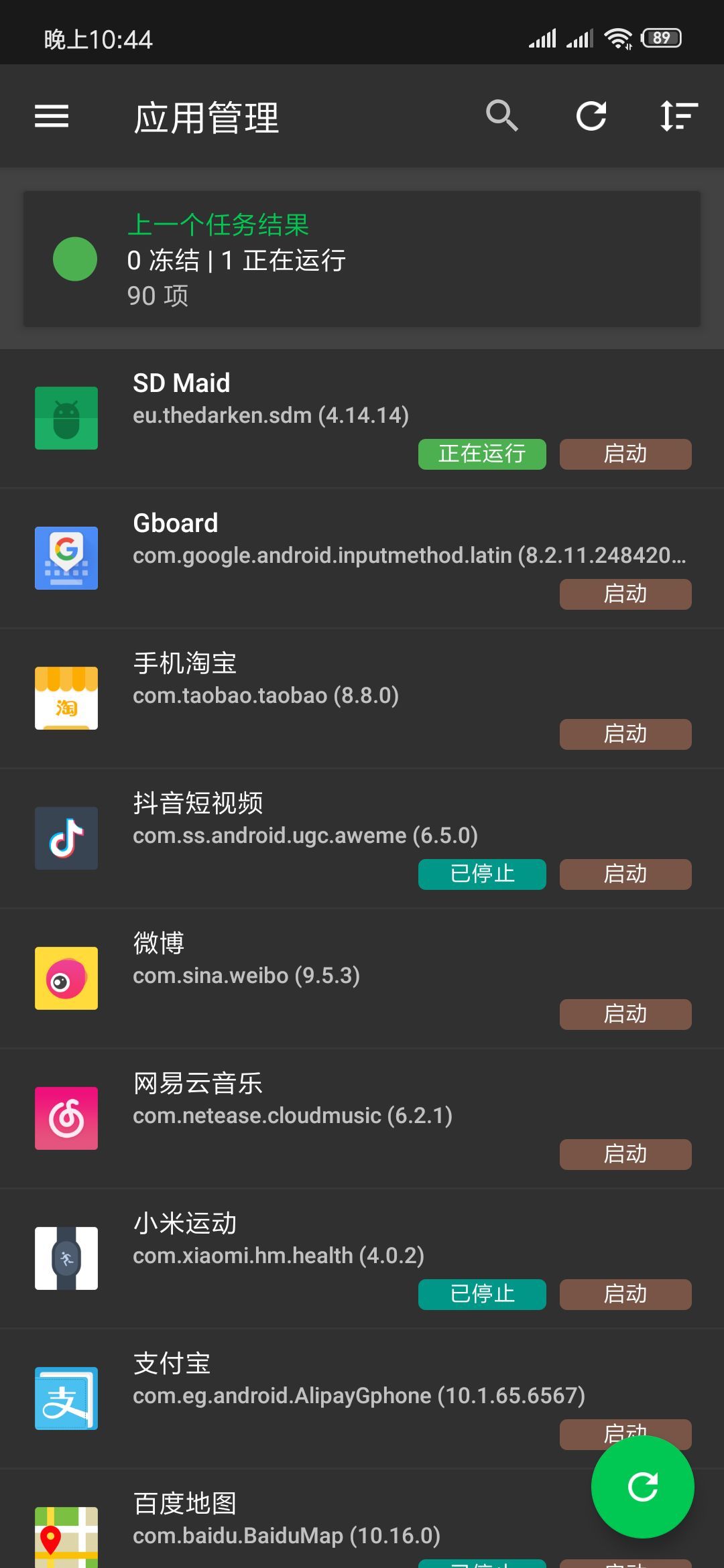 「SD女佣」的应用管理可以让你启动、结束、强行停止应用,导出 APK 文件,及冻结、重置以及卸载应用程序等。