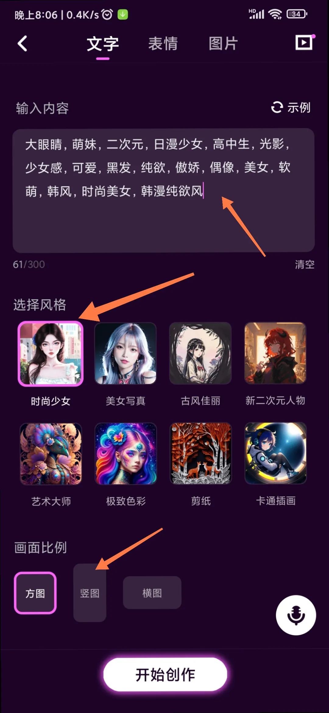 输入你想要生成图片的关键词,选择图片风格、画面比例即可一键生成AI图片!
