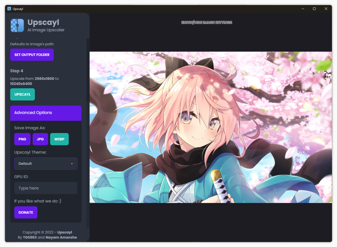 另外还有 Batch Upscale 可以批量处理图片、Double Upscayl 可以把图片放大到 8 倍、Advanced Options 高级设置可以选择图片输出的格式以及手动输入 GPU ID。
