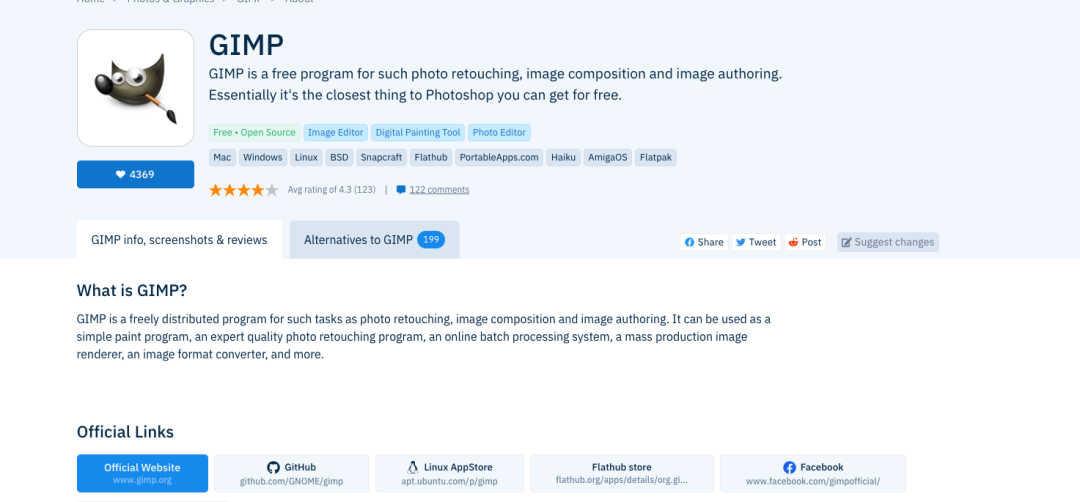 GIMP 这个图片处理工具应该不少姬友都很熟悉,点进去就是详细介绍页啦,页面中可以看到关于这个软件的介绍、官方链接、用户评论以及下载链接。
