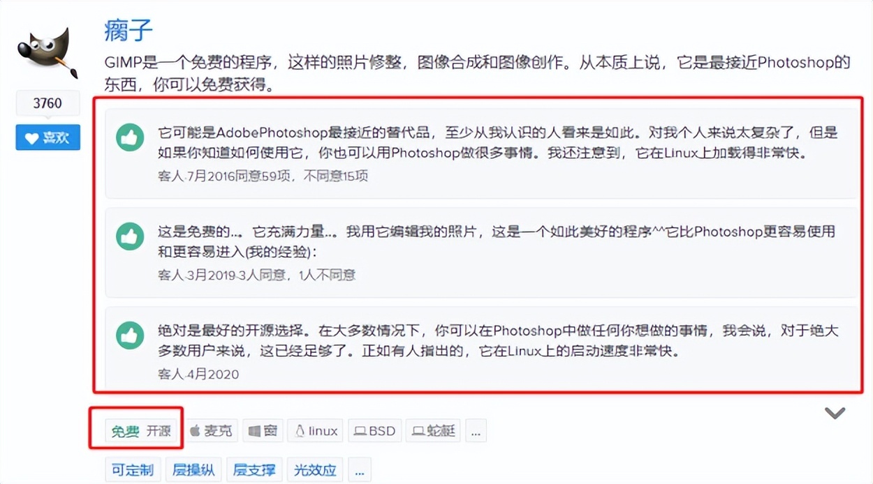 所有推荐软件都按照“喜欢”和相似程度进行了排序,PS的替代软件排第一的是「GIMP」,也有不少用户对它的正面评论。