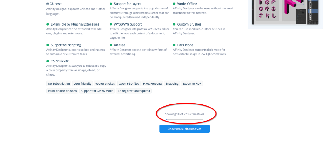 点击软件即可跳转到相似软件的推荐页,比如点击 PS 进去推荐页,总共竟然有223个推荐软件!