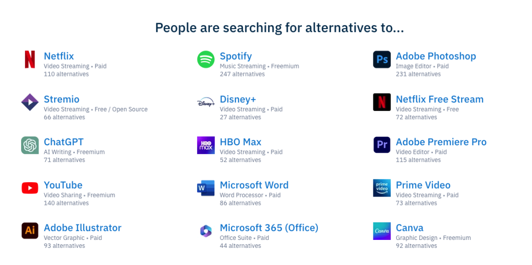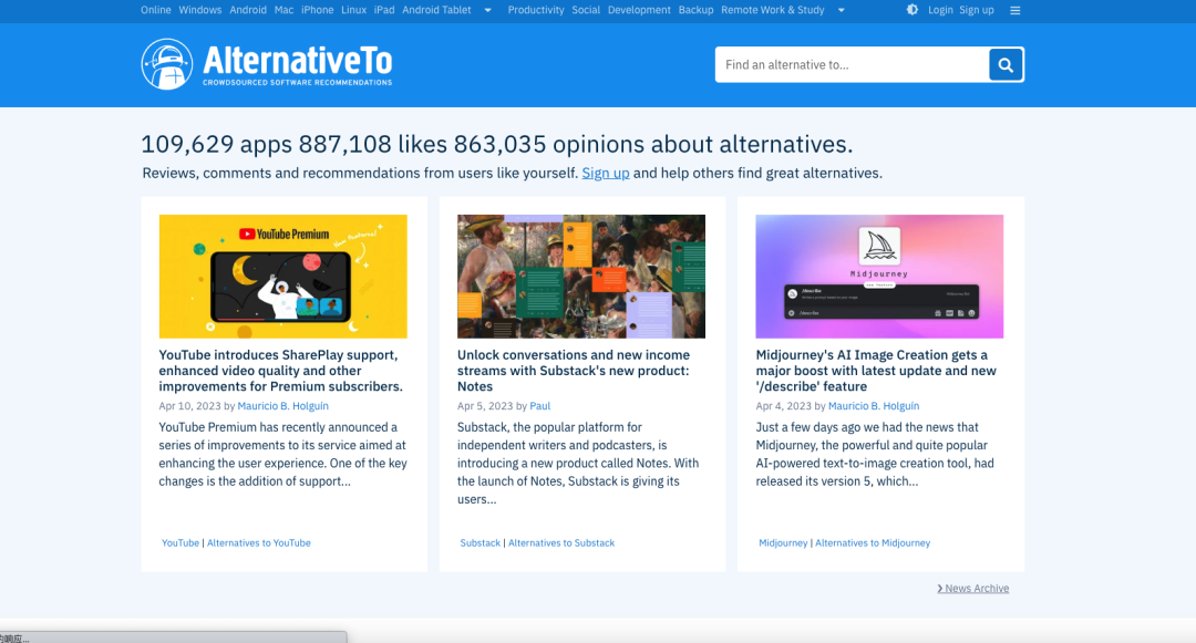 AlternativeTo是一个同类软件或app查找网站,网站推荐的软件均可下载,完全「免费」且「正版」,当你喜欢一个软件或app时,可以在 AlternativeTo 找到与它相类似的推荐。