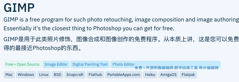比如 GIMP 的标签包括了 免费、开源、图片编辑器、支持的系统等,点击就可以跳转到含有同标签的软件推荐页啦,查找更加有效率。