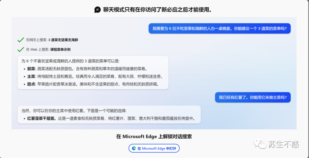 之前分享过微软 new bing 集成到edge浏览器 ,现在向所有人开放了,不用申请登陆微软账号就可以用,新必应提供可靠的最新结果,并提供问题的完整答案,当然,它还会引用来源,不仅可以用new bing 搜索、聊天,还能生成图片、分析网页,未来支持历史聊天记录和通过插件向第三方开放new Bing 。