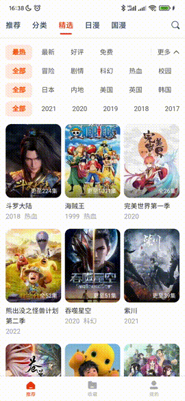 打开精选页面,可以看见有很多动漫分类,而且分的非常详细,有动漫类型的分类,冒险、剧情、科幻、热血这些,还有动漫属地、年份这些分类。