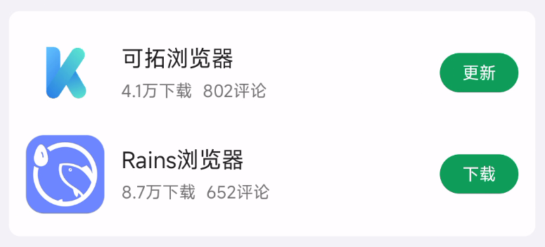 现在雨见的作者有3个严格遵守规范的版本,在谷歌商店更新的雨见浏览器国际版、界面接近雨见的Rains浏览器,以及雨见的进阶版可拓浏览器。