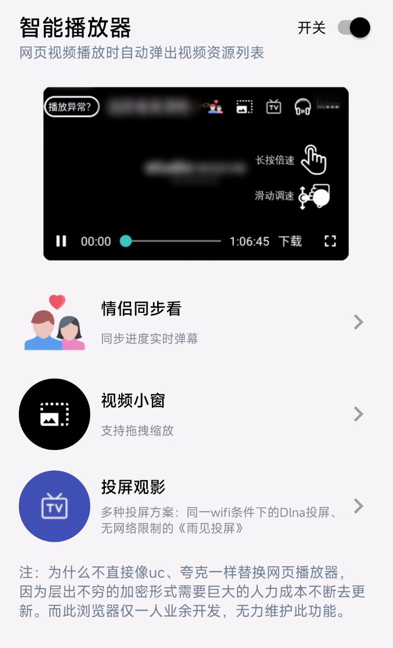 另外还有一些很妙的功能,比如说可以给一些网页书签加上密码、下载的时候启动多线程、网站手势和自定义网页字体、照顾精简爱好者的强迫症选项、网页资源投屏功能。
