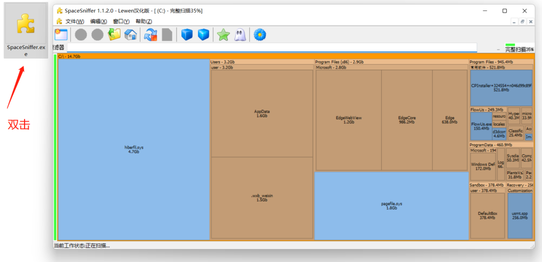 等待分析结果,完成后以方格的形式展示出磁盘上各个文件夹和文件的大小,根据不同的大小来给方格涂上不同的颜色,这样可以很直观地看出哪些地方占用了过多的磁盘空间。然后右键菜单进行文件的打开、删除等操作。