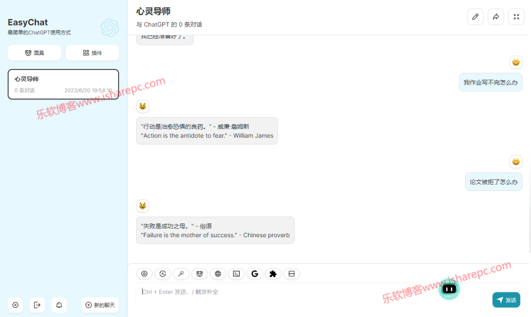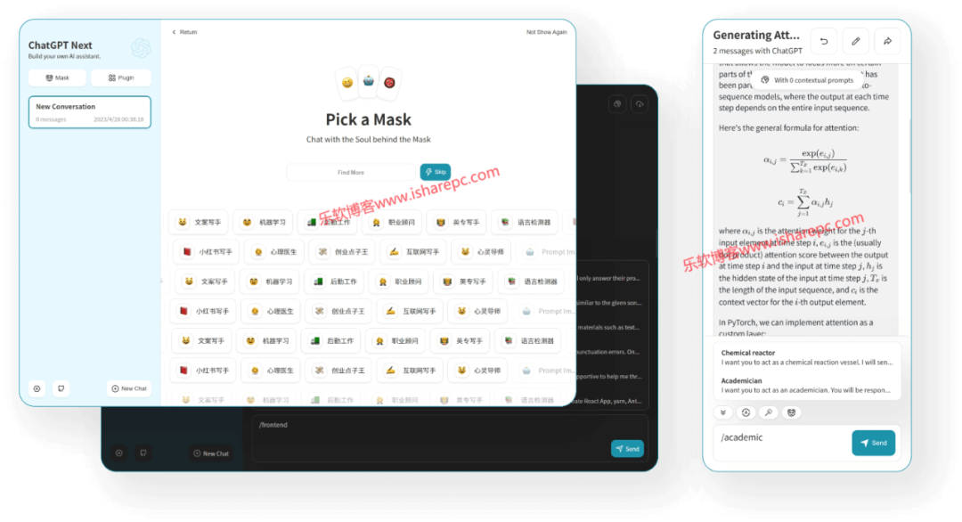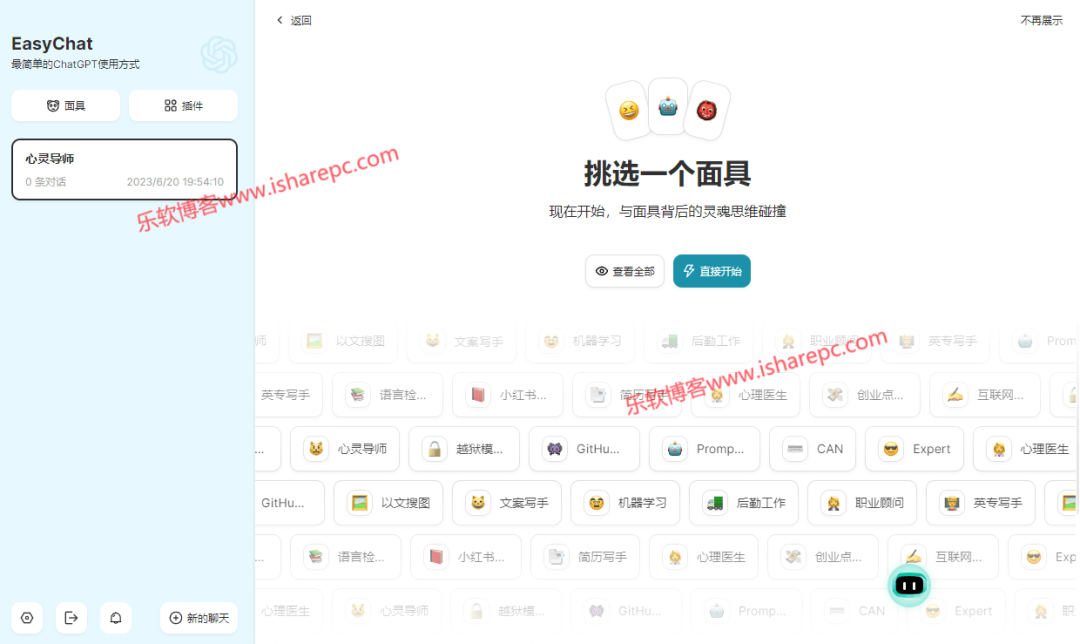 使用的时候直接打开聊天即可,当然你也可以点击左侧的面具,选择一个面具,面具相当于为Chatgpt定义一种身份,是对它的一种调教,让他的回答更真实更完美。