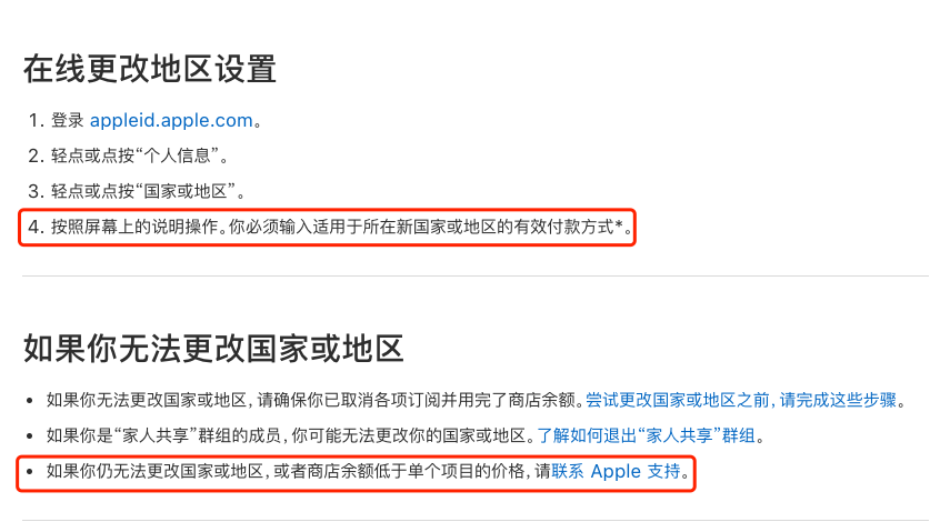 如果你已经充了值,也不是没有办法,你可以把土区账号转移到国区,进入家庭再转回土区,可是里面存的余额就浪费了。苹果官方对账号的转区是这么说的:苹果官网支持文档-更改 Apple ID 国家或地区