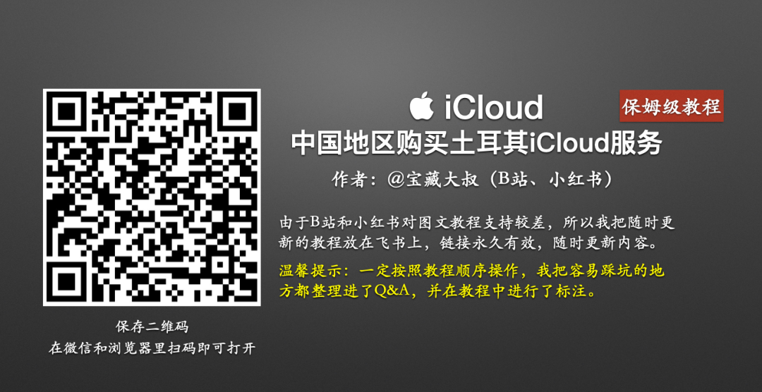 原文地址:https://btsogiwudc.feishu.cn/docx/CgoJdHyWKopl3UxV12GcG3psnjf【在飞书中,作者会不断地更新教程,祝各位都能用上便宜好用的iCloud服务,上车愉快】