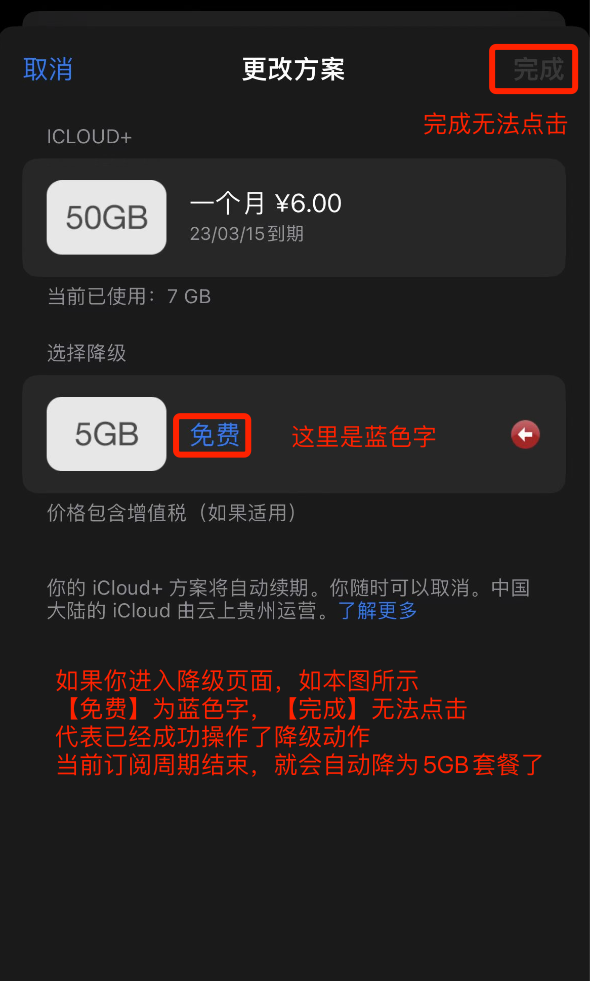 注意:此处虽然操作降级成功,但订阅期并没有终止,会在订阅周期结束后才把空间降级到5GB,在未降级的这段时间中,偶尔会出现国区账号莫名奇妙又切换回原来的国区订阅的情况,只需要在发生情况的设备上重复操作第③步即可。若想根除问题,建议直接申请退款,当苹果把钱退给你的时候,就同步完成了真正意义的空间降级,也不会再出现订阅跳回国区的bug了:具体操作点这里