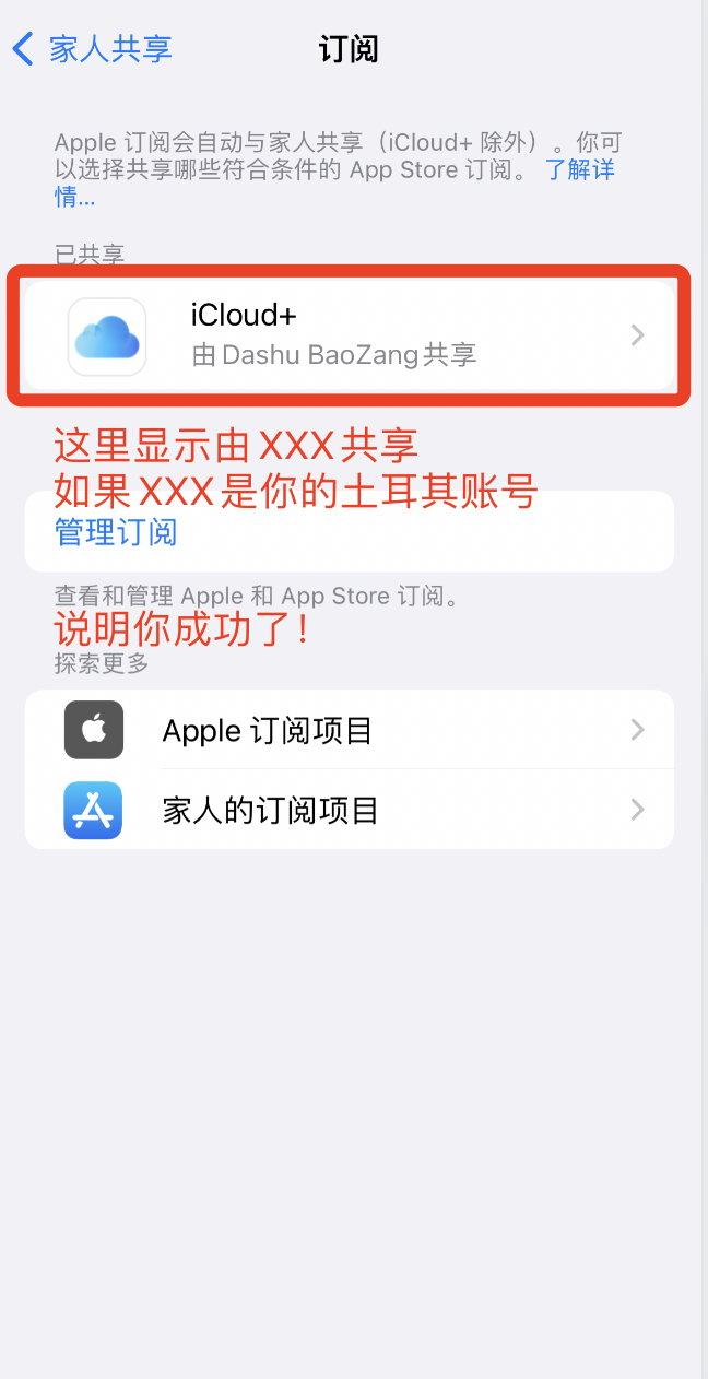使用国区家庭成员账号,【设置】》【头像】》【iCloud】》【管理储存空间】》【更改储存空间方案】,根据弹出窗口的内容判断是否已经成功使用了土区的iCloud共享;