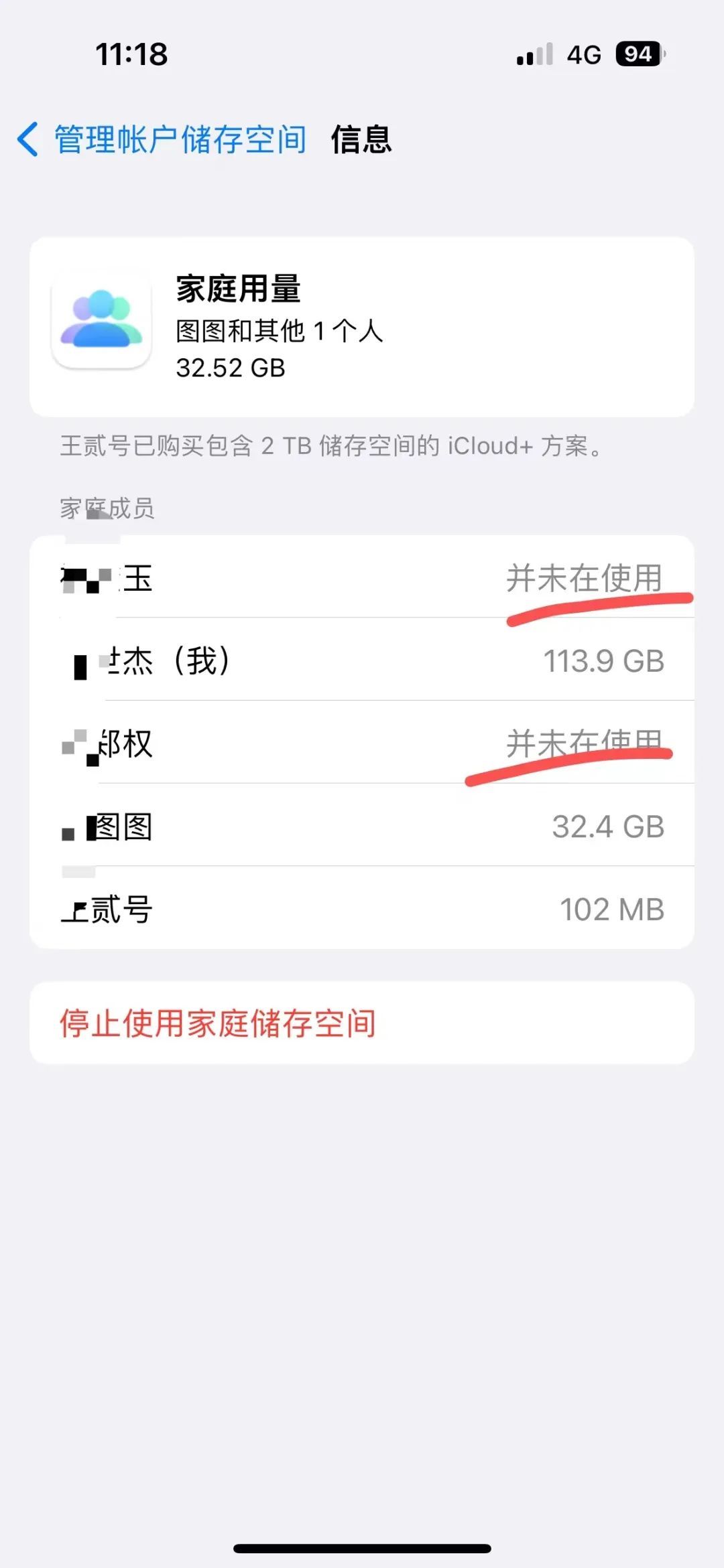 如果你在查看iCloud的家庭用量中,发现你的家庭成员中,有显示【并未在使用】,但成员实际使用却正常,请不要担心,这是苹果的BUG,不影响正常使用。