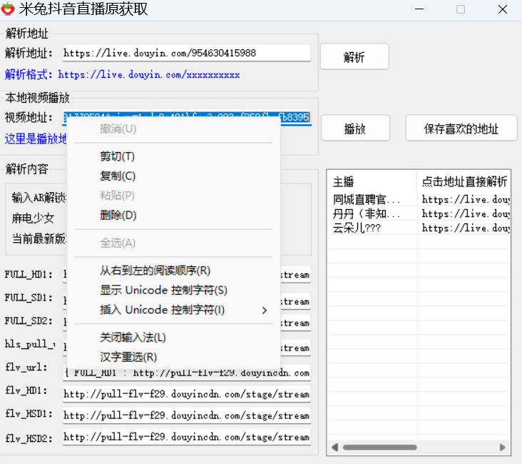将链接粘贴进米兔抖音直播源获取工具,点「解析」,软件会自动生成本地视频直播地址,而这个地址就是视频直播的在线直播源。