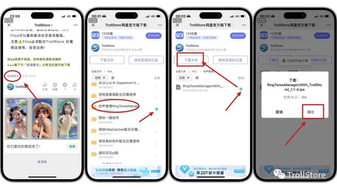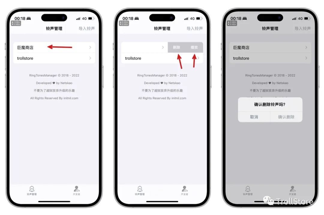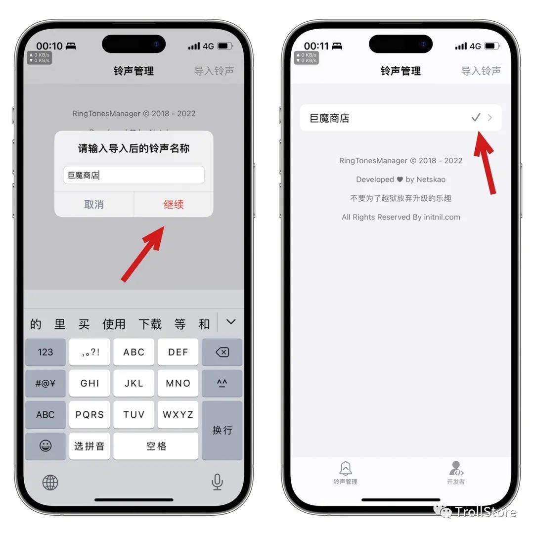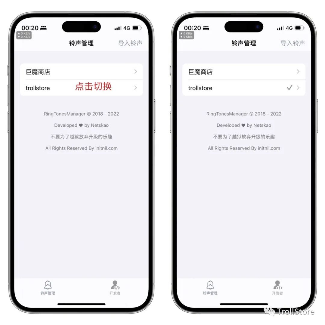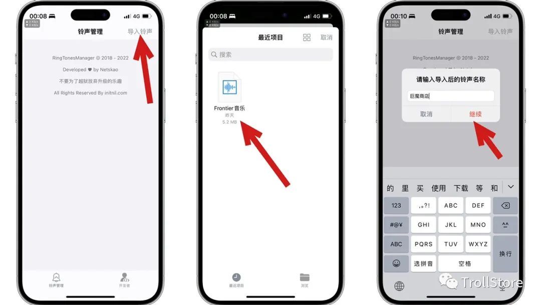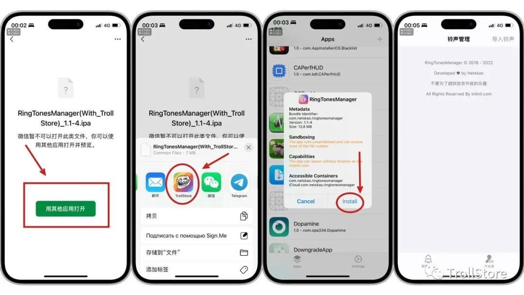 下载方法,我们在文章底部点击 阅读原文 找到RingTonesManager安装包,点击下载,下载好了点击用其它应用打开,选择用TrollStore 巨魔商店打开,点击Install安装。