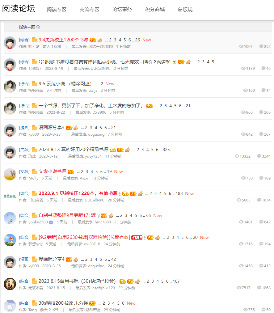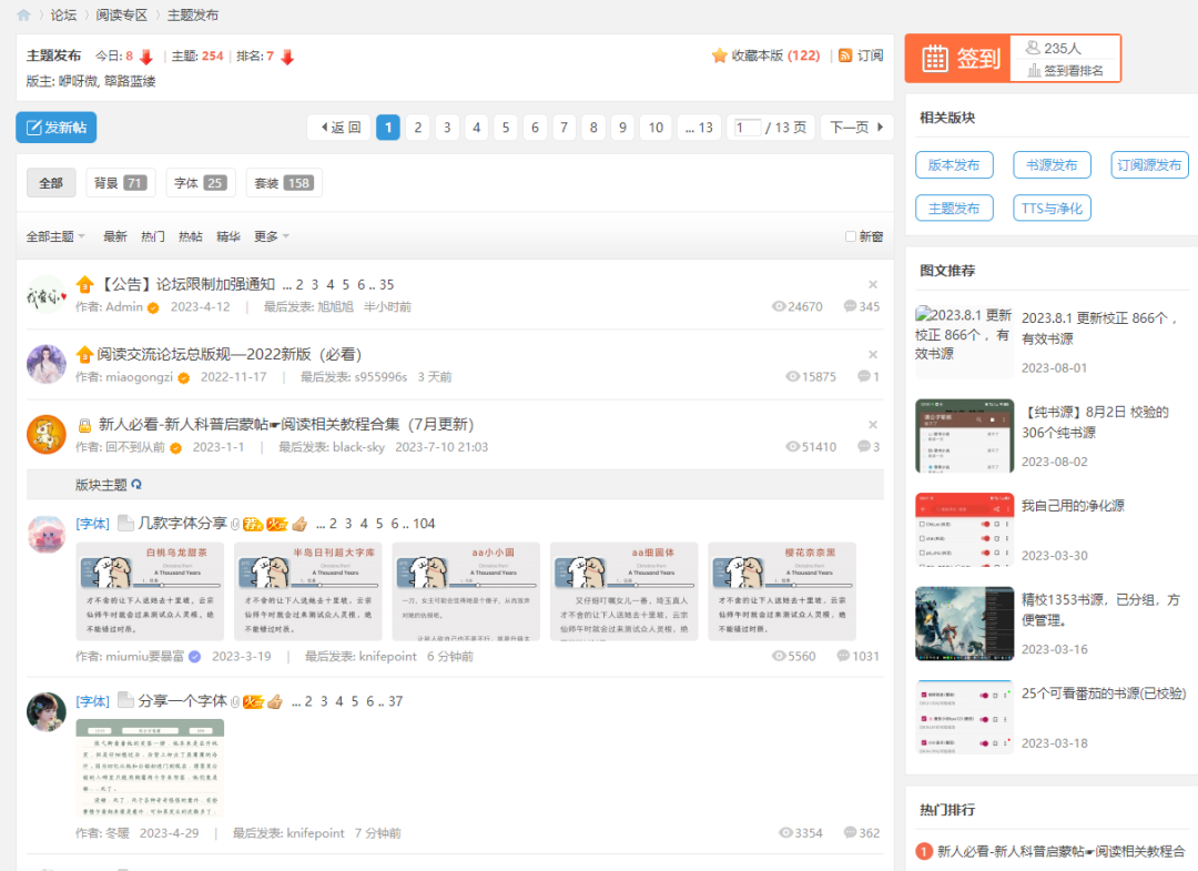 论坛包括了好几个板块:书源发布、订阅源发布、主题发布、TTS 与净化。