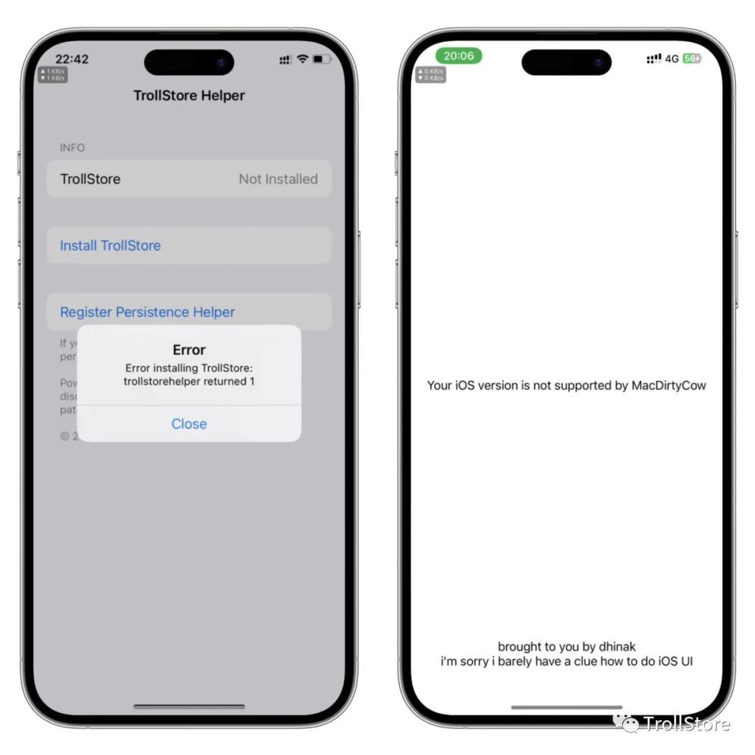 有很多粉丝用了上面第二种安装方法去安装TrollStore 要不就提示不支持,要不就卡在安装器那儿,提示错误1,下面看教程,教你们另外一种方法,成功率高。