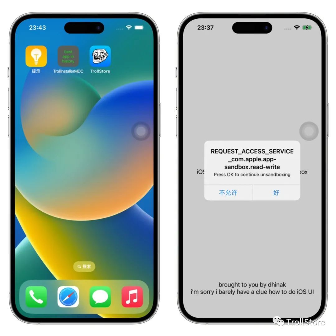 TrollStore支持版本:iOS14至iOS15-16.5 16.5.1 16.6 16.6.1 17.0,但是目前16.5.1 16.6 16.6.1 17.0还没安装方法,也就是说16.5.1以上系统目前还不能安装,本次发布的巨魔商店2暂时支持iOS15-iOS16.5系统,可以安装并且使用。