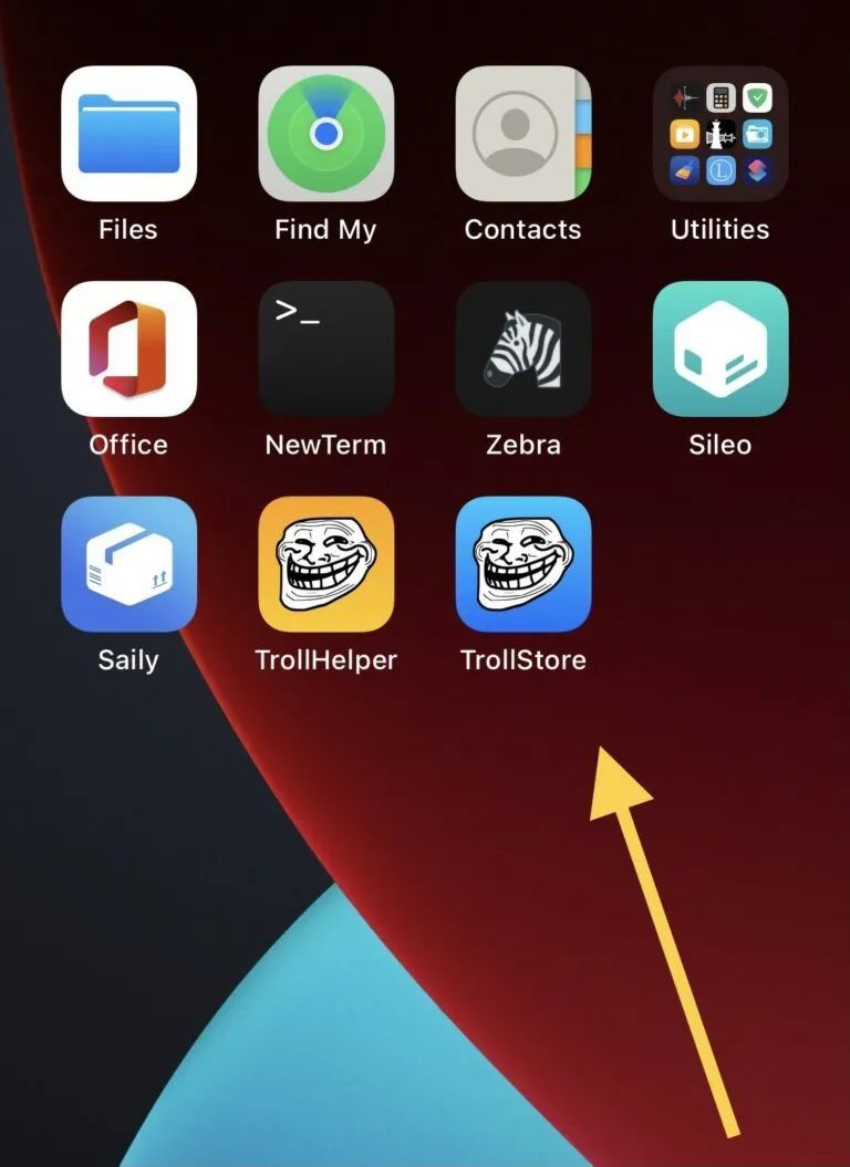注意:你的设备会重新启动,当它重新启动时,应该会在主屏幕上找到 TrollStore 应用程序,如下所示: