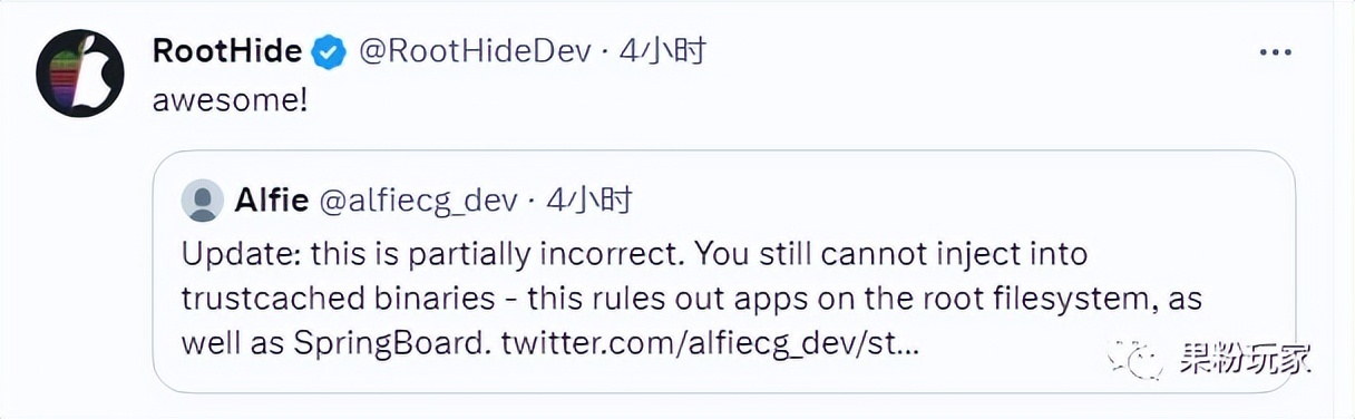 所以说重大消息也没错,随后RootHideDev 转发并称赞新方法NB。