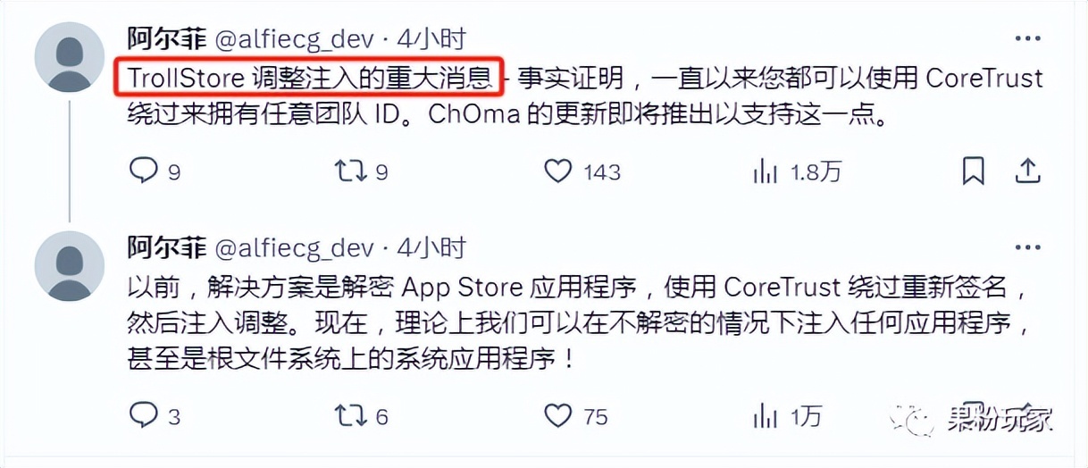 alfiecg_dev发表了一个TrollStore 调整注入的重大消息,无须解密即可注入AppStore应用的新方案,并开源发布了。