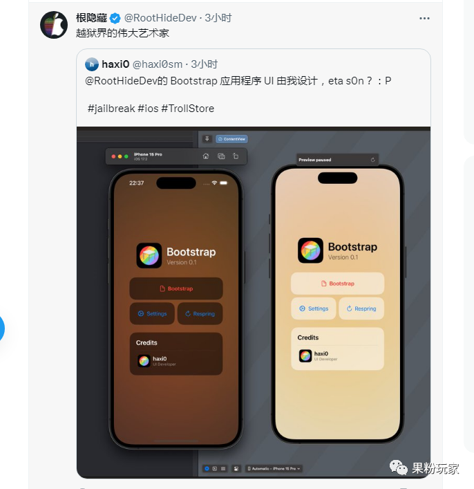 Alfie开源更新了ChOma,可使 CoreTrust 拥有任意团队 ID,这样可无须解密AppStore应用;RootHideDev 转发文章并表示NB,他还转了一组Bootstrap的设计UI生图。