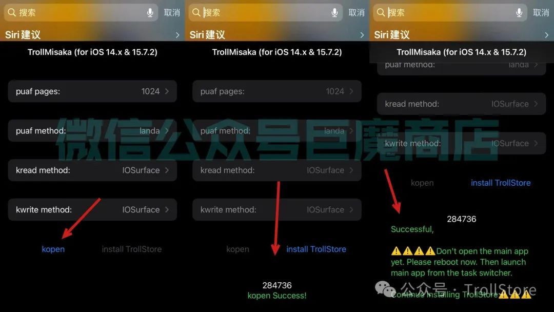 这里需要注意,它并不是那么容易成功的,如果你点击kopen出现闪退你就多重复操作几次,如果你好不容易到了第二步 出现了 kopen Success 这个提示,后面点击install TrollStore ,下面显示