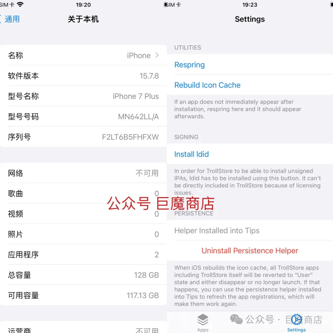 打开以后点击Install TrollStore,稍等片刻,选择需要注入的app 这里我们选择平时不用的官方app即可。点击app以后看到上图右显示的内容也就成功了。可以说是整个流程非常的快,也非常的方便。成功率也非常的高,至少我是一次就成功了。