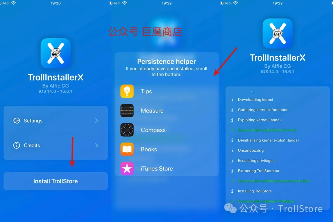 使用TrollInstallerX遇到的一些问题解答,如果卡在Exploiting kernel… 可以手动重启手机再试试,如果出现无法打开TrollStore,可以尝试打开注入自带应用进行刷新,提示无法进行补丁查找的错误,手机必须联网,提示无法注入自带应用,可以尝试后台大退出工具重新再试。注意此工具还是需要科学上网,不然无法获取Idid