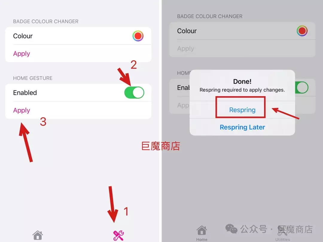 安装打开Mugunghwa以后,点击右下角设置,打开Enabled后面的开关,再点击Apply,最后点击Respring,它会菊花注销,注销成功以后就修改成功了。那么Mugunghwa如何修改锁屏主题,接着往下看。