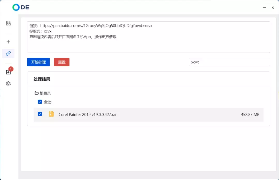 解析功能使用特别简单,粘贴百度网盘链接进文本框,点击“开始处理”,在下方处理结果会显示链接对应的文件。