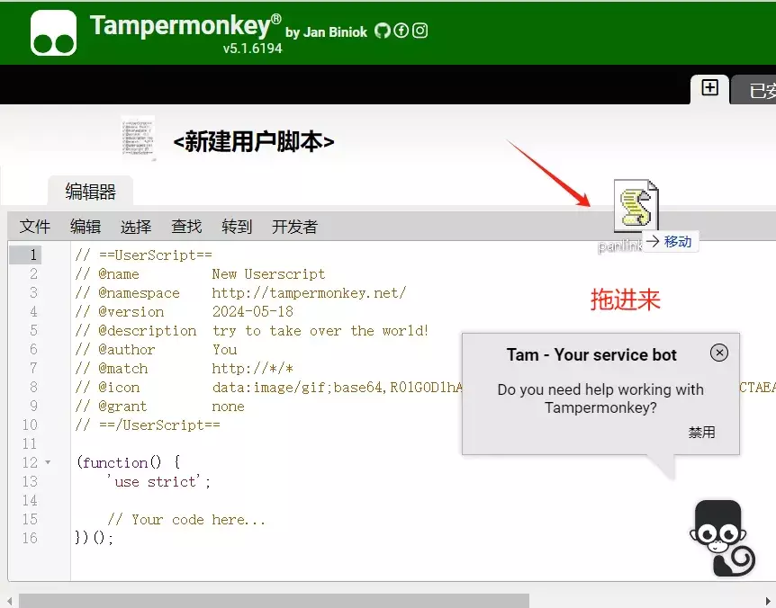 在新建用户脚本页面,拖进小编提供的本地脚本 js 文件,安装脚本。