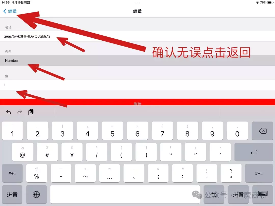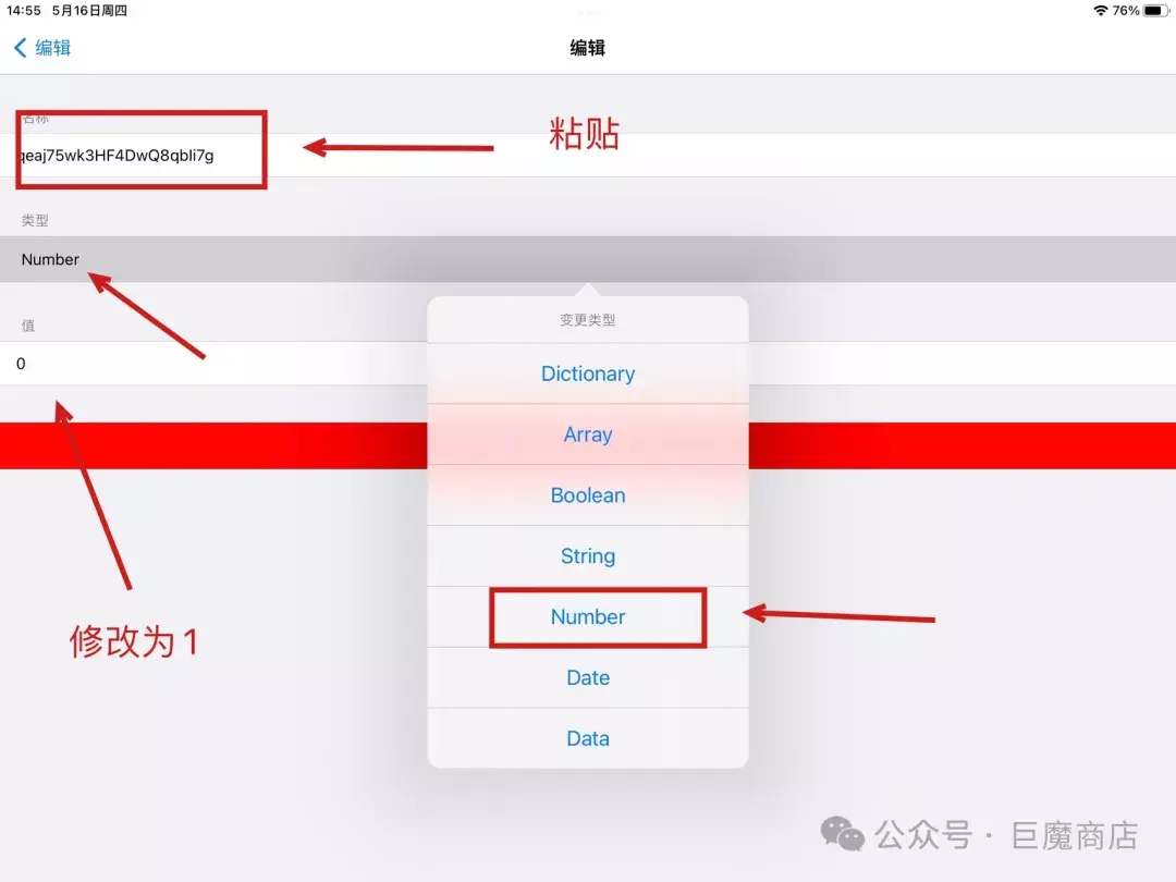 添加好了以后再点击添加好的New item ,第一个名称我们长按粘贴刚才复制的第二个代码,类型我们选择Number 值修改为 1