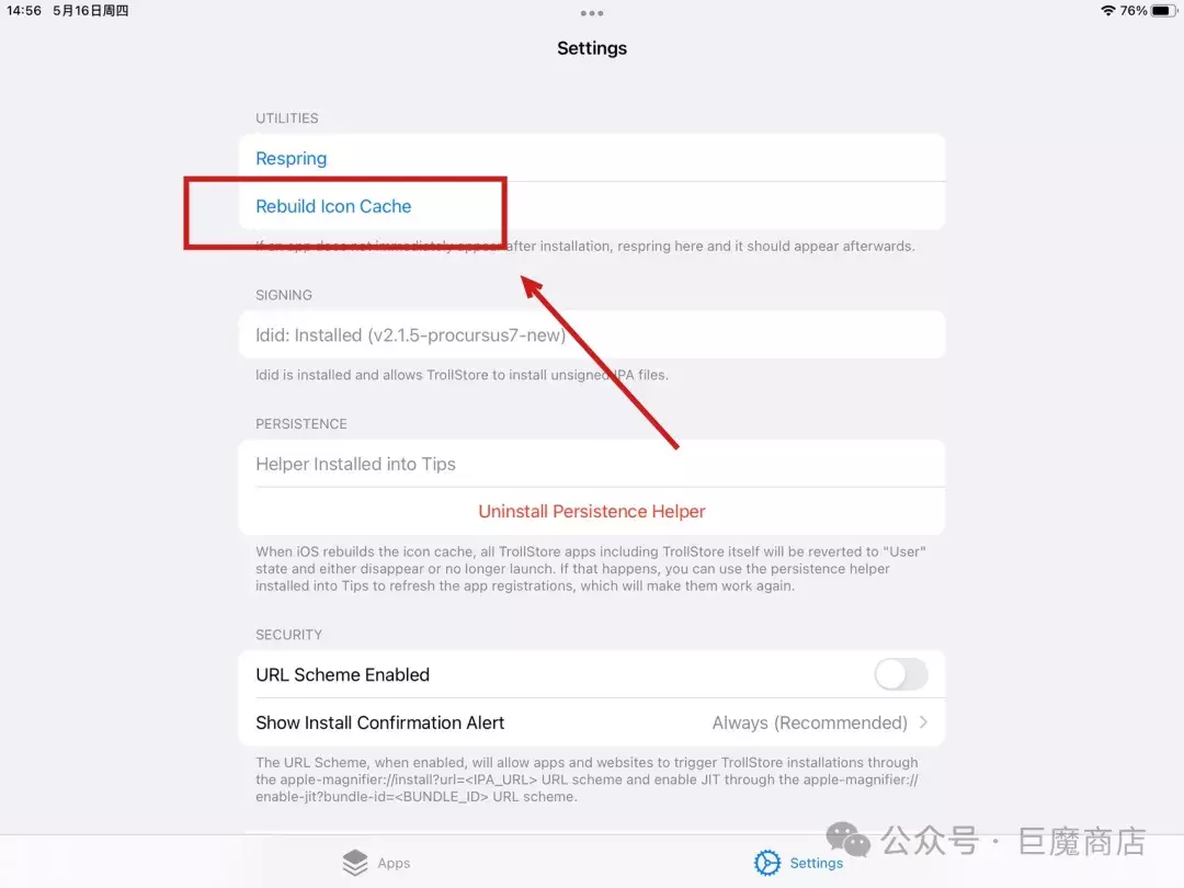 存储以后,iPad 还不能正常显示,这个时候,我们打开一下巨魔商店,点击右下角设置,再点击一下 Rebuild Icon Cache 或者Respring iPad 会注销