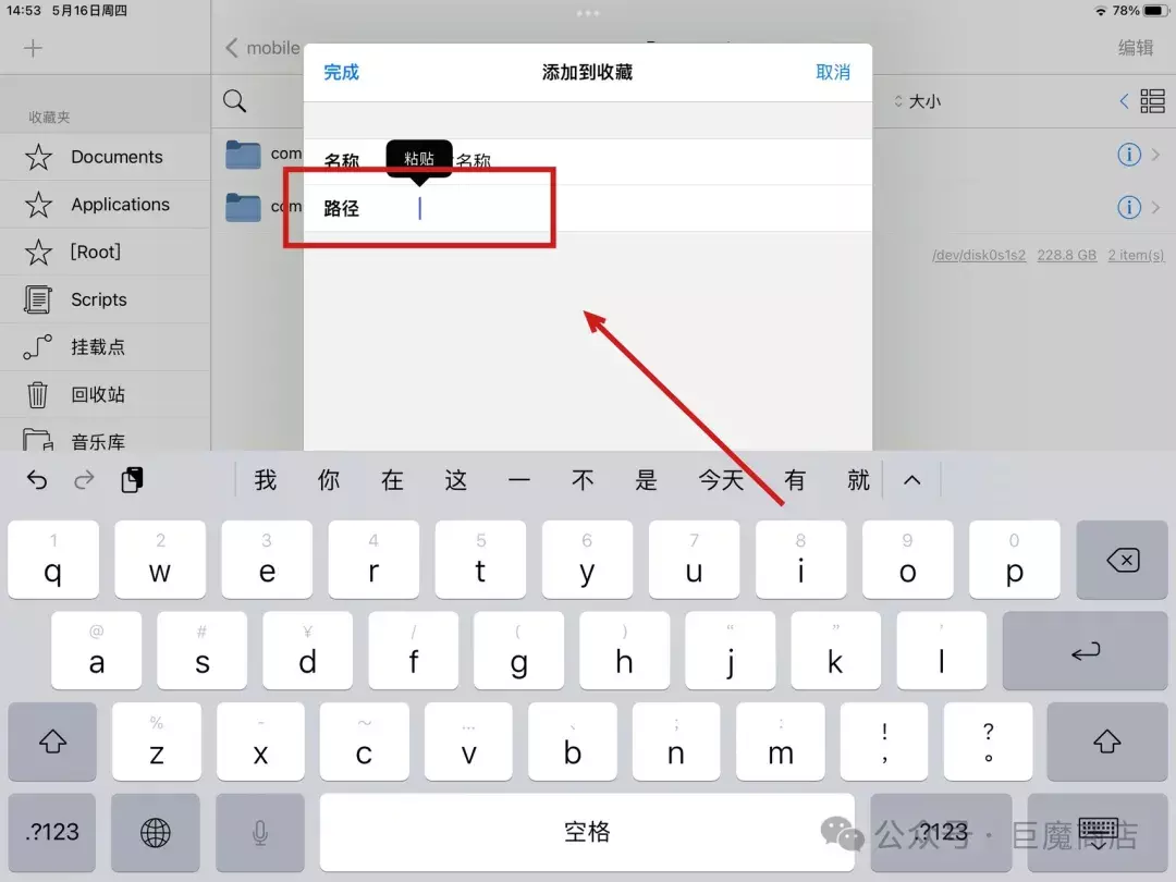 这里添加名称,我们随便添加一个,路径长按,点击粘贴