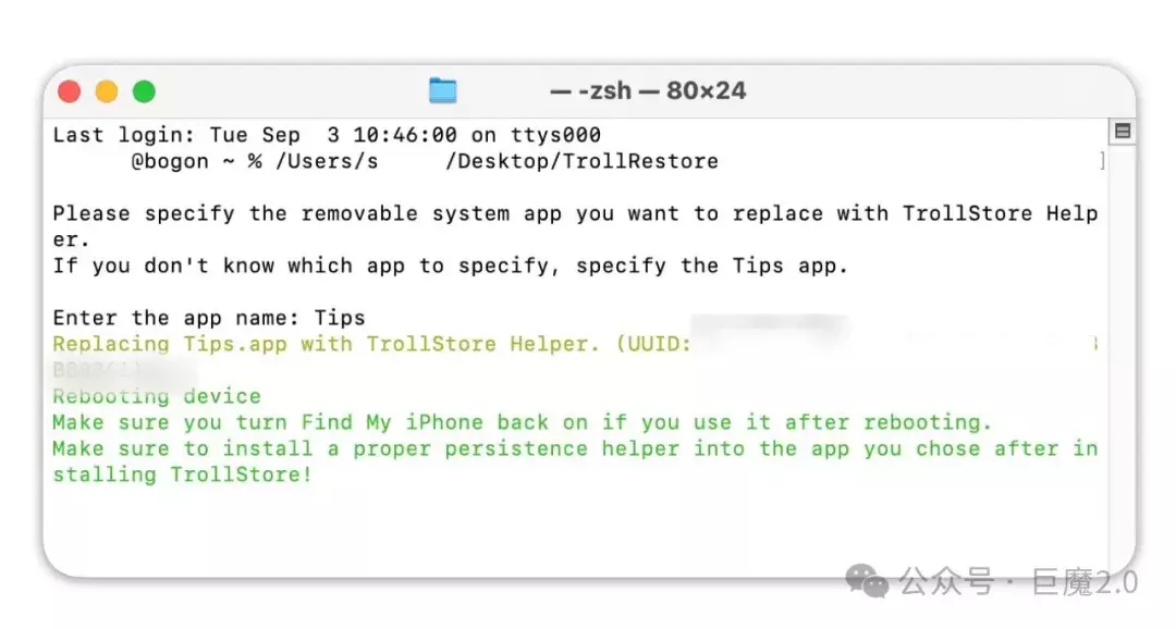 稍微等待一会儿,他会提示上方图片内容,这个就证明已经成功了。手机会黑屏注销一下。等手机再亮屏的时候提示已经注入好安装器了。在使用电脑安装巨魔的过程中如果出现红色报错,记得多试一试,多检查一下步骤是否正确。以上就是今天所有内容,欢迎大家在留言区讨论交流!