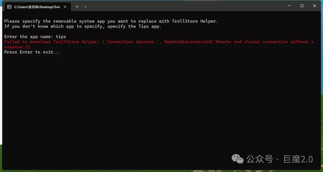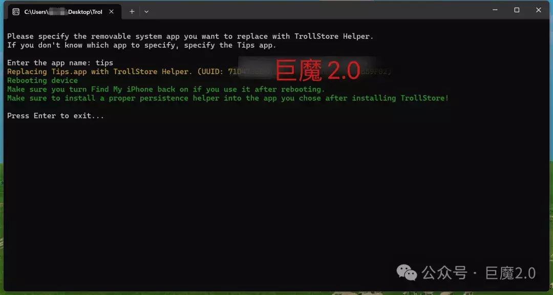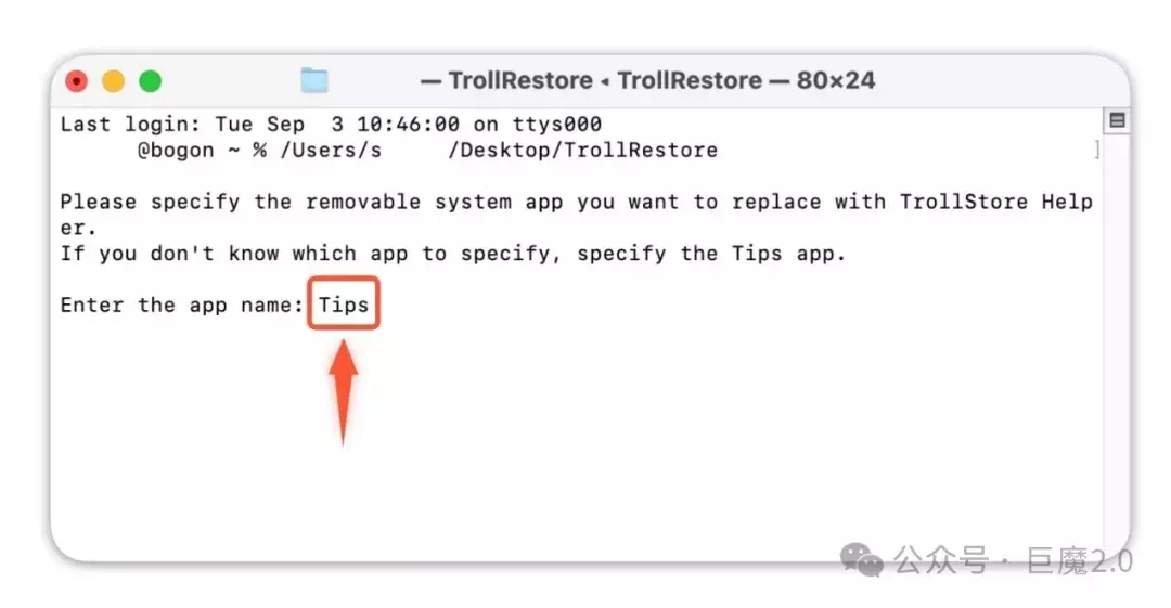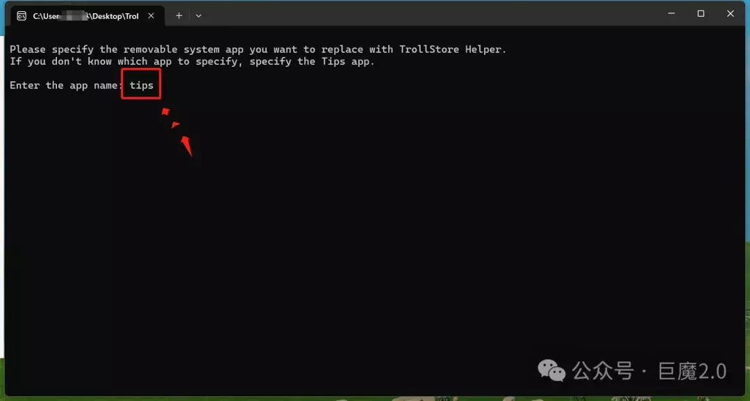 然后双击打开 TrollRestore ,出现弹窗就点允许。稍等一下就可以看到上图界面,需要手动输入:Tips 然后键盘上点击回车键