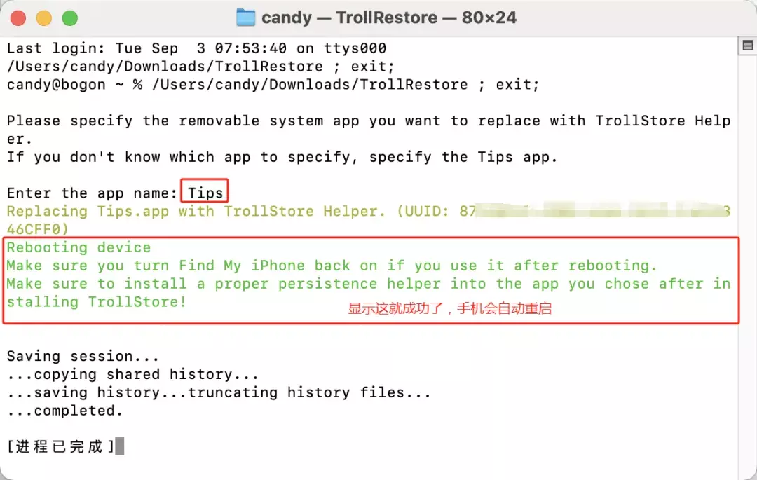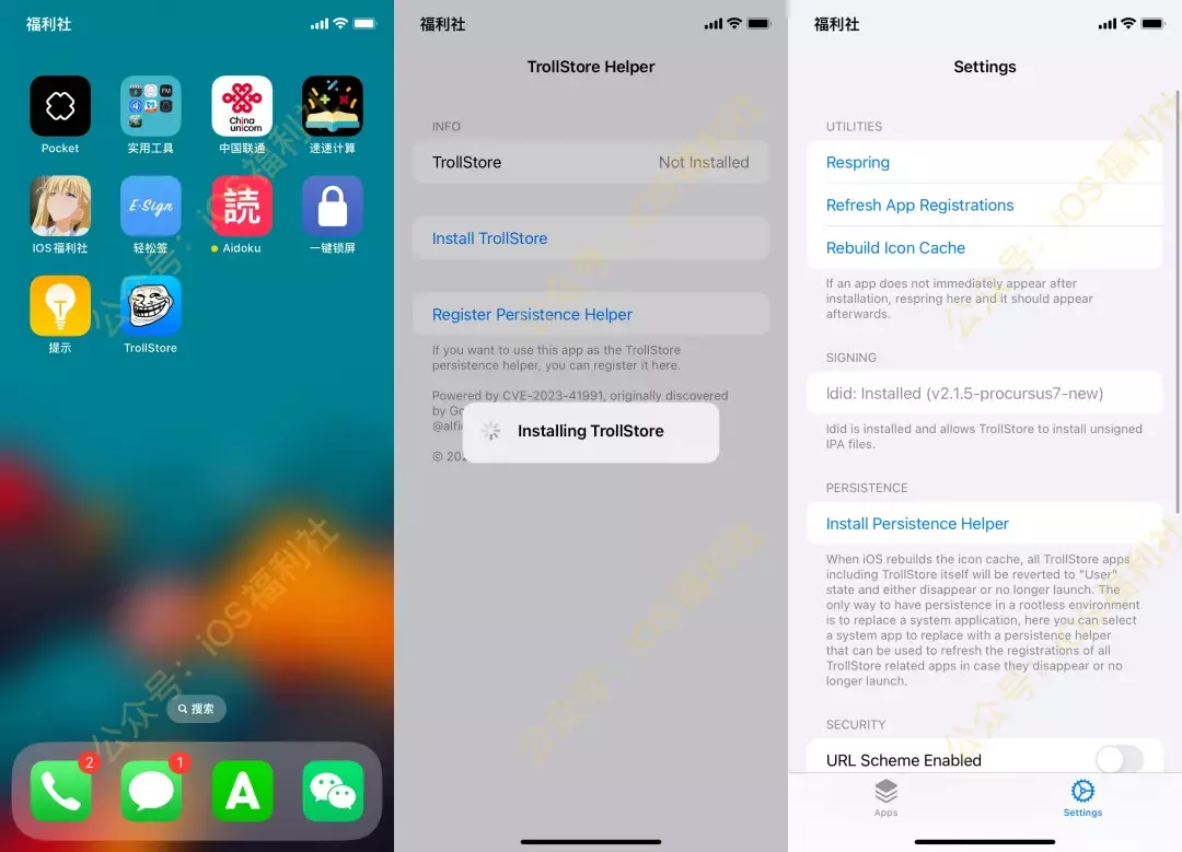 手机这时会自动重启,重启后打开手机桌面上的提示APP,-点击Install TrollStore,等手机注销事,桌面就会出现TrollStore了。
