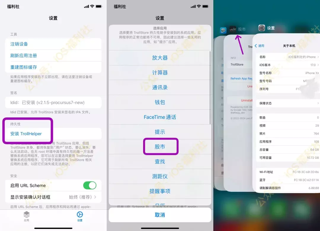 安装持久性助手:打开 TrollStore -安装TrollHelper-选择股市APP(或者其它你用不到的),如果要选提示(请先删除提示,再重新下载,不删除直接选有风险),以后TrollStore 打不开了,就打开股市APP,刷新一下即可。